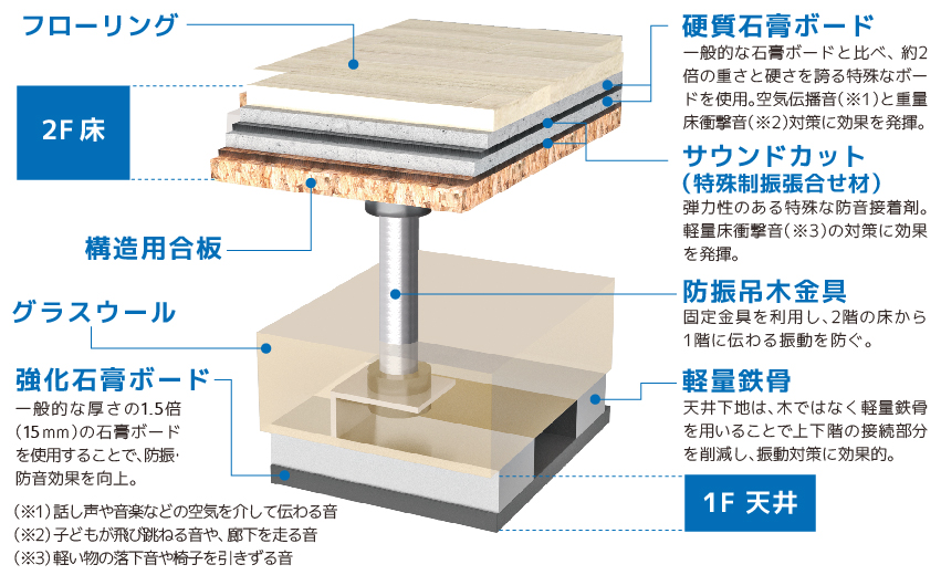 作為防止說話聲音和音樂的措施,使用重型材料來抑制聲音傳播。對於孩子跑來跑去的聲音,增加了地板本身的重量,抑制了地板的振動。彈性材料吸收了拖動椅子的聲音的影響。