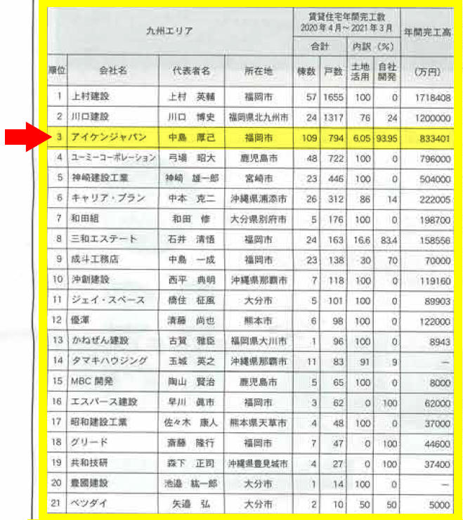 弊社は、2020年度の完工棟数109棟、完工戸数が794戸で九州エリアで昨年に引き続き「第3位」 を獲得いたしました。