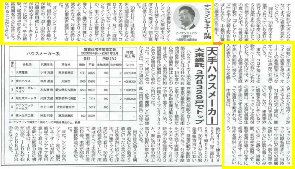 全国賃貸住宅新聞第1466号(2021年 6 月 28 日発行)にて「賃貸住宅に強い建築会社ランキング」が発表されました。