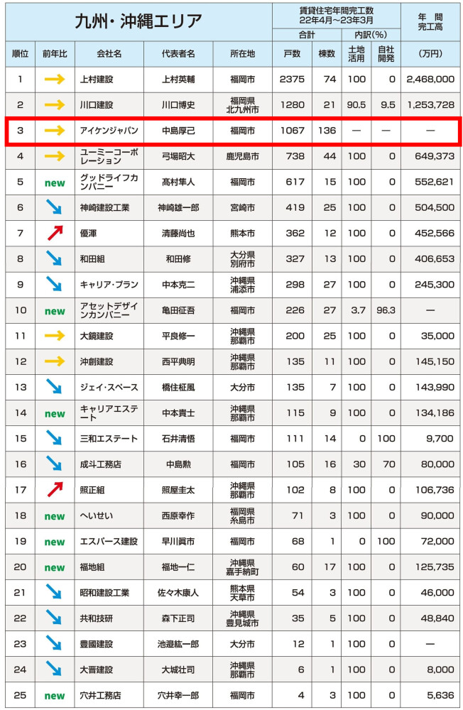 賃貸住宅年間完工数ランキングで第3位を獲得(九州・沖縄エリア)