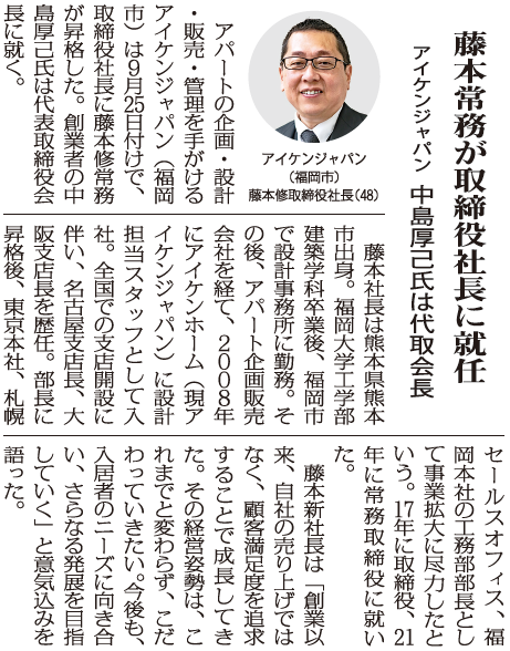 新社長就任の記事が全国賃貸住宅新聞に掲載されました
