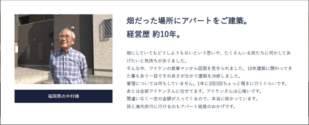 中村様は、ご自身の土地に弊社のアパートを建築いただいており、初回取材から年月が経った現在も、14年に渡り満室稼働を継続されています。